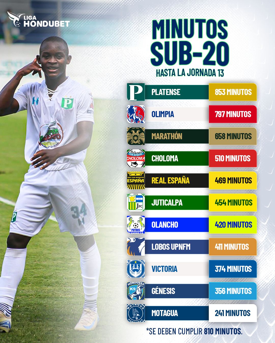Recordemos que temporadas atrás los clubes de Liga Nacional debían utilizar al menos durante 540 minutos en el Torneo a un jugador Sub20, pero para esta nueva temporada, en asamblea de Liga Nacional se determinó incrementar a 810 minutos, lo que equivale a utilizar a un jugador sub20 en al menos 9 partidos completos de la fase regular.